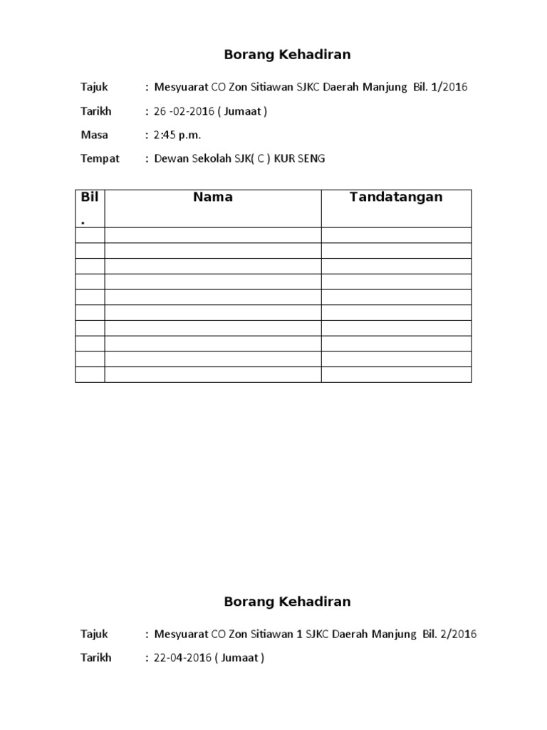 Contoh Borang Kehadiran Mesyuarat Page 1 Line 17qq Com