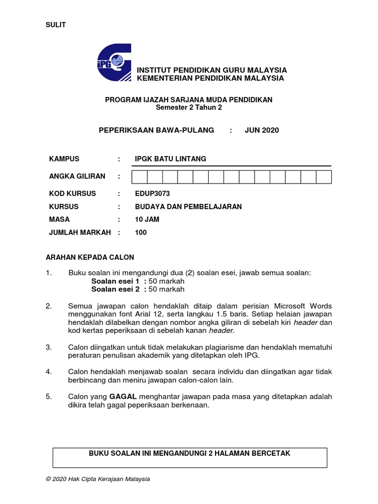 Ten Chia Ting 2018111340122 Kertas Jawapan Edup 3073 Docx Sulit Institut Pendidikan Guru Malaysia Kementerian Pendidikan Malaysia Program Ijazah Course Hero