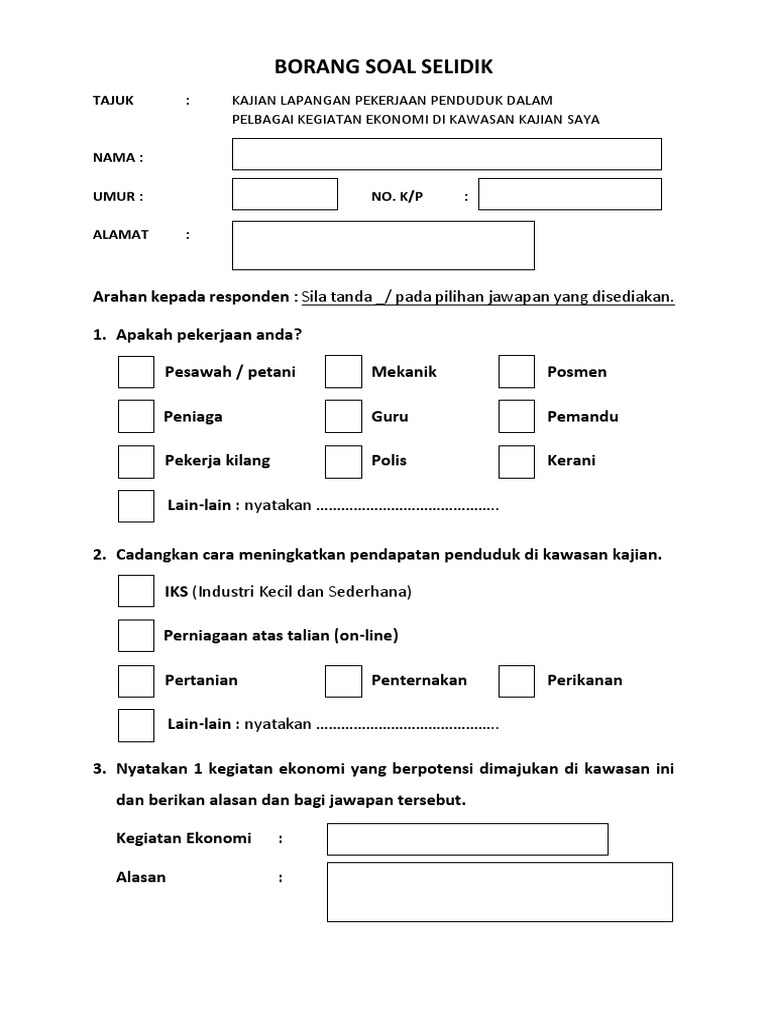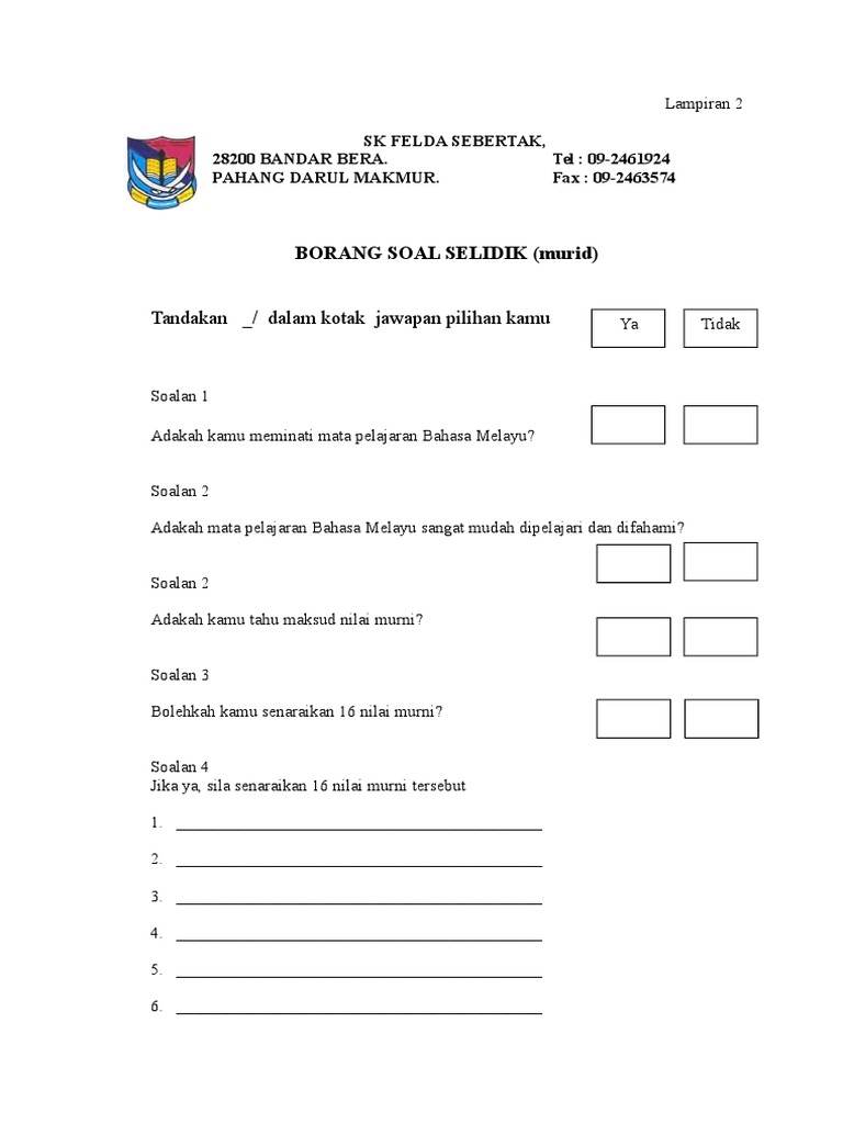 Tandakan Dalam Kotak Jawapan Pilihan Kamu Borang Soal Selidik Murid