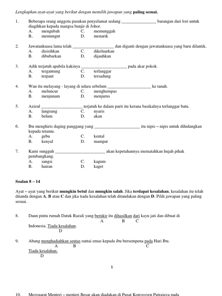 Lengkapkan Ayat Ayat Berikut Dengan Memilih Jawapan Yang Paling Sesuai
